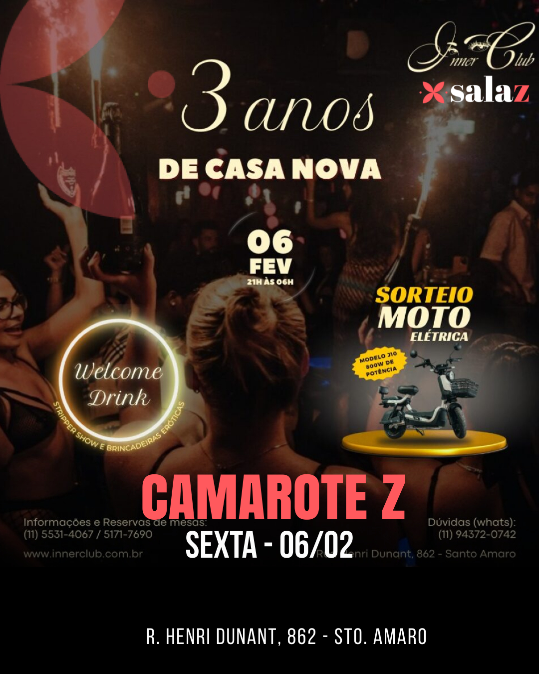 Vamos comemorar juntos os 3 anos de casa nova da Inner Club *Welcome Drink *Sorteio *Shows e Brincadeiras Entrada consumível para casais e mulheres